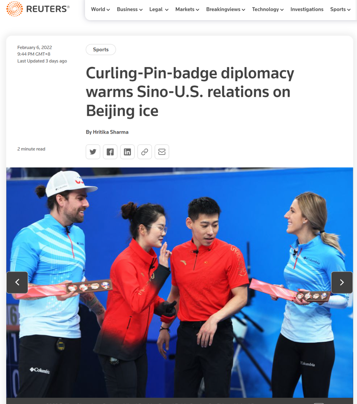 中国选手凌智6日透露,当天回到更衣室,就已经收到美国队回赠的徽章。他说:“冰壶就是一个社交性的运动,我们运动员之间都是非常友好的关系。”