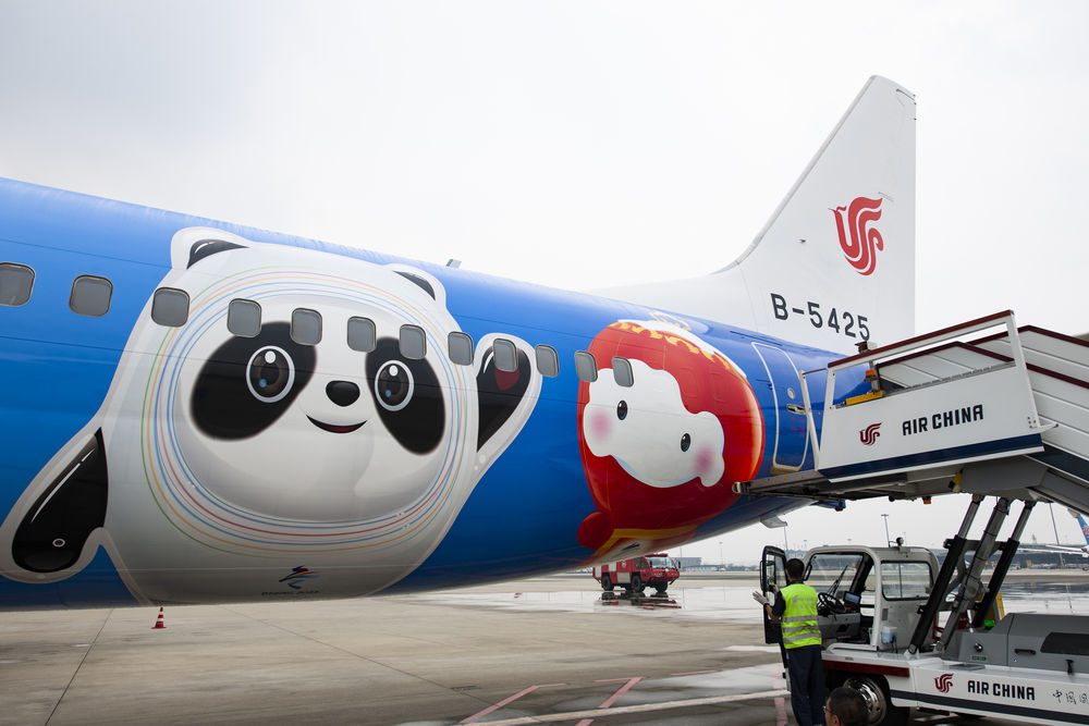 ↑这是2020年9月5日在成都双流国际机场拍摄的“冬奥冰雪号”彩绘飞机机身,上面喷涂着吉祥物“冰墩墩”和“雪容融”。新华社发(中国国际航空股份有限公司供图)