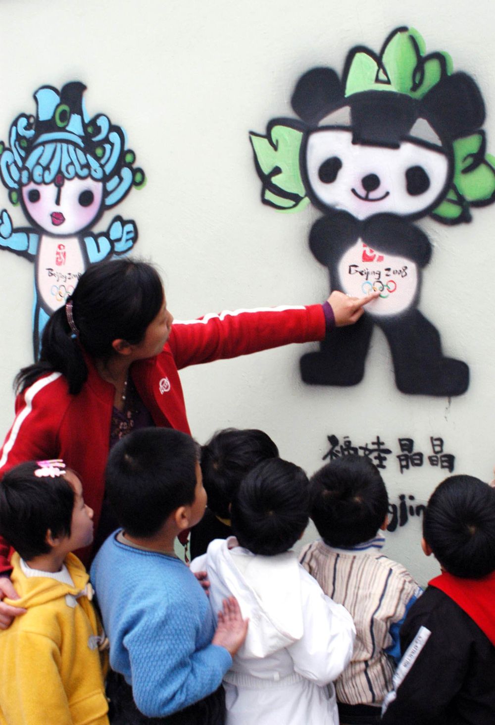 ↑ 2005年11月14日,幼儿园的小朋友听老师介绍奥运吉祥物“福娃”的来由。新华社发(许卫平摄)