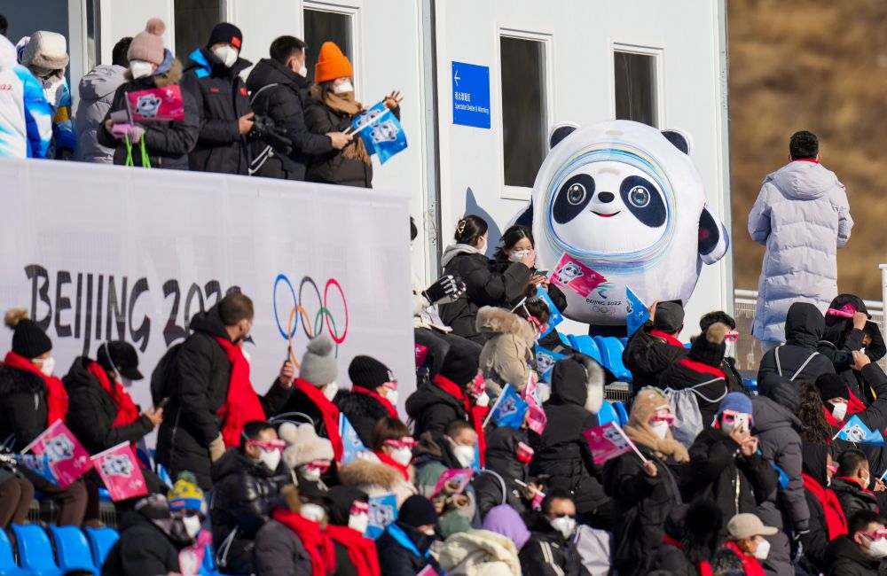 ↑2月6日,吉祥物“冰墩墩”在2022年北京冬奥会越野滑雪男子双追逐(15公里传统技术+15公里自由技术)比赛现场与观众互动。新华社记者 刘潺 摄