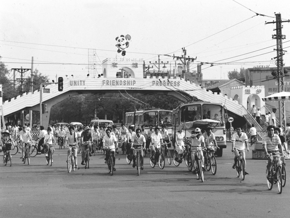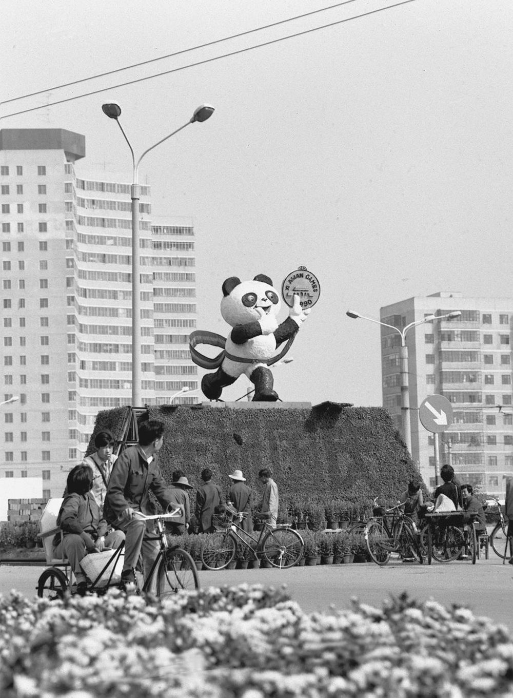 ↑北京东单十字路口,第十一届亚运会吉祥物“盼盼”正翘首盼望远方的朋友。 新华社记者黄景达摄(1990年8月27日发)