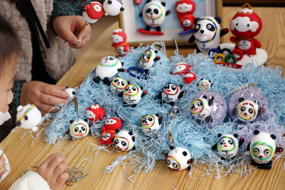 ↑2022年2月10日拍摄的上海西渡街道金都雅苑居民尚月娥指导小区孩子们制作的“冰墩墩”“雪容融”。 新华社记者 刘颖 摄