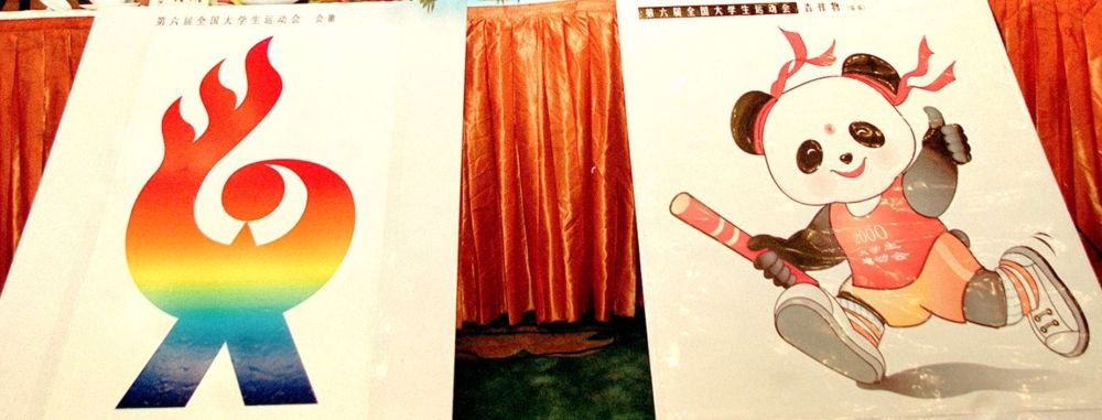 ↑2000年3月16日,第六届大学生运动会组委会在北京举行新闻发布会,公布了大运会的会徽(左)和吉祥物形象。新华社记者高学余摄