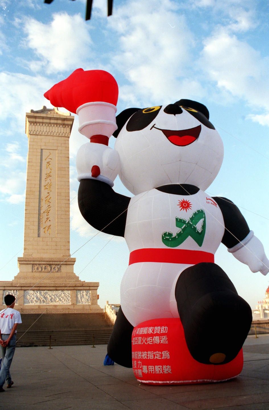 ↑天安门广场上,第十一届亚运会吉祥物、大熊猫“盼盼”手擎火炬,笑迎八方佳宾。新华社记者汤孟宗摄(1990年9月17日发)