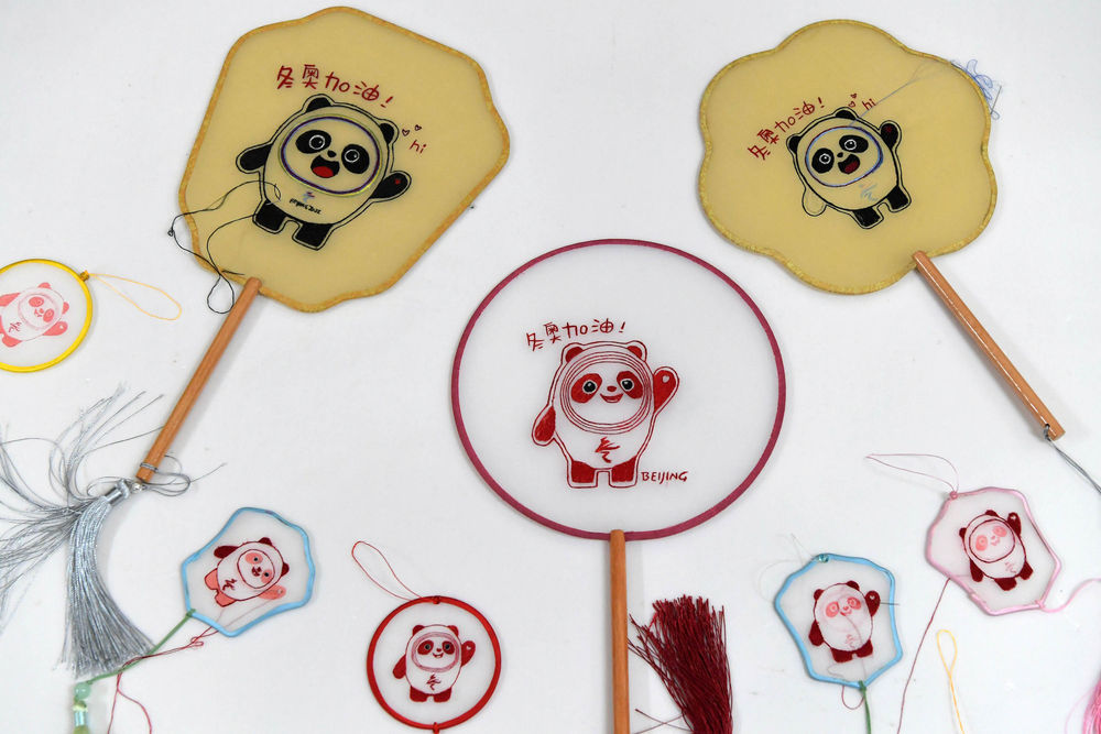 ↑在江西省南昌市东湖区豫章绣技能人才培训基地,这是绣娘和孩子们一起绣制的“冰墩墩”(2022年2月10日摄)。新华社记者 彭昭之 摄