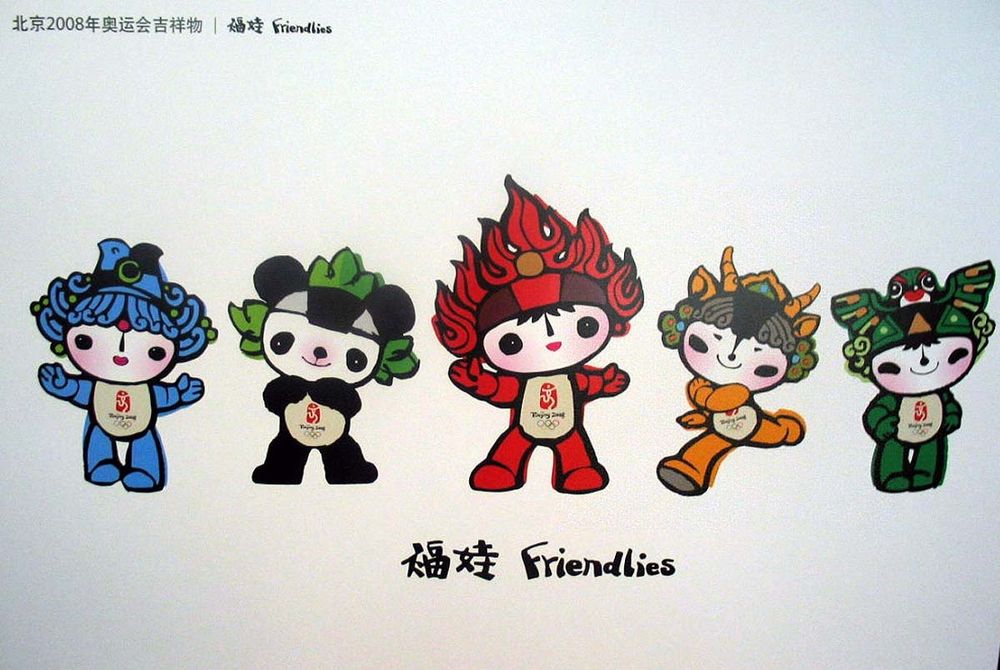 形象分别为鱼、熊猫、奥运圣火、藏羚羊、京燕