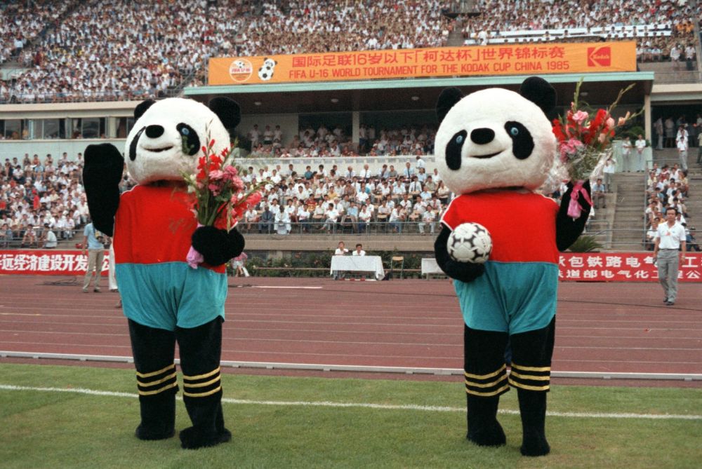 ↑首届国际足联十六岁以下柯达杯世界锦标赛的开幕式于1985年7月31日在北京举行。本届锦标赛吉祥物大熊猫“华华”在开幕式上向观众致意,对来自五大洲的朋友们表示欢迎。新华社记者程至善摄