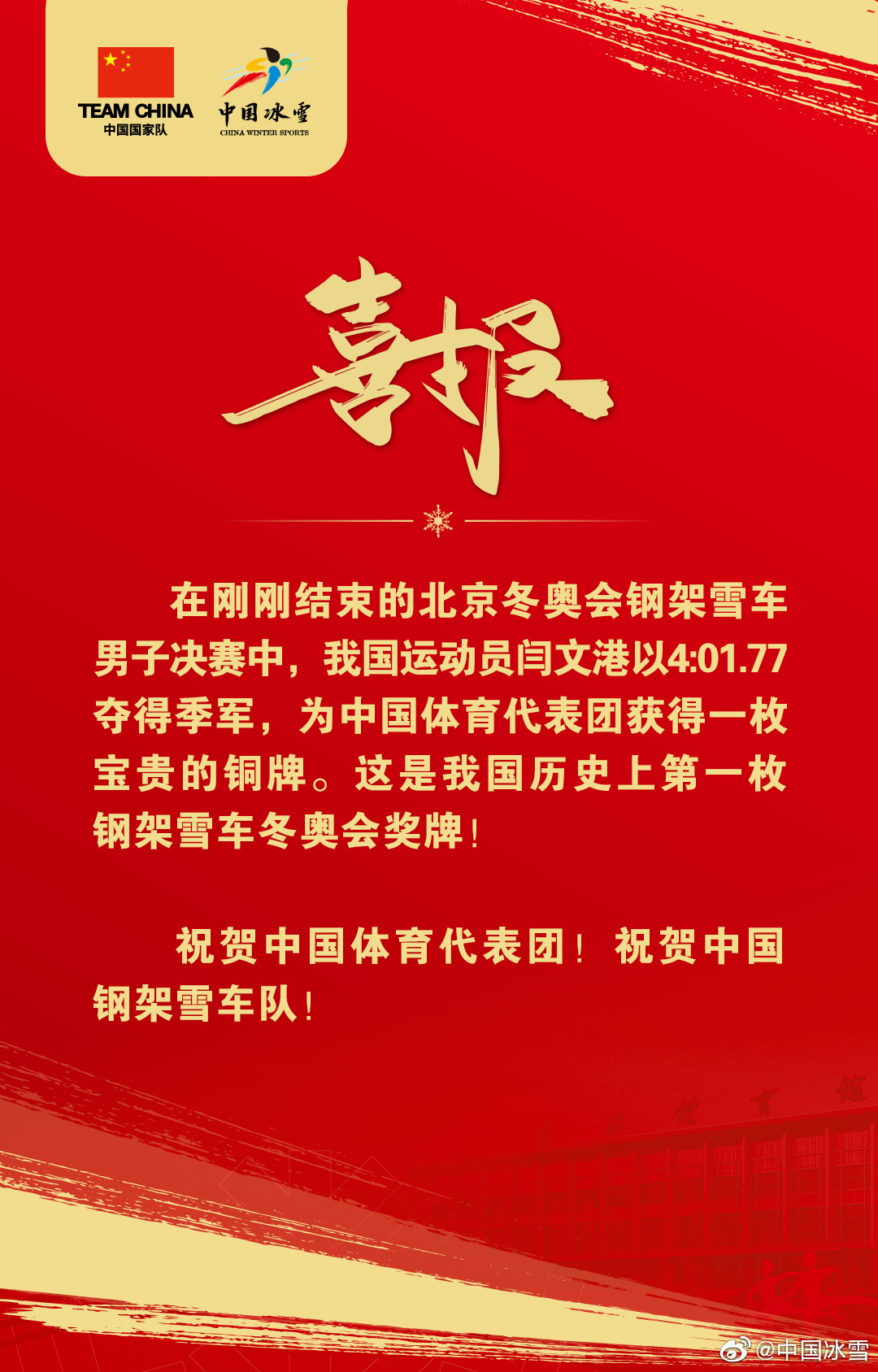 据 @中国冰雪 消息,在2月11日晚中国选手闫文港夺得北京冬奥会男子钢架雪车铜牌后,国家体育总局冬季运动管理中心发来贺信。全文如下: