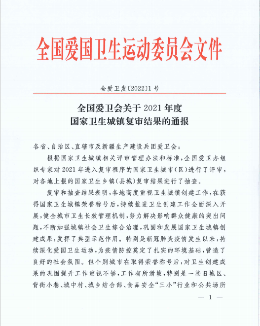 近日,全国爱卫会通报了2021年度国家卫生城镇复审结果: