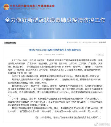 截至2月11日24时,据31个省(自治区、直辖市)和新疆生产建设兵团报告,现有确诊病例1436例(其中重症病例6例),累计治愈出院病例100791例,累计死亡病例4636例,累计报告确诊病例106863例,现有疑似病例1例。累计追踪到密切接触者1555374人,尚在医学观察的密切接触者37471人。