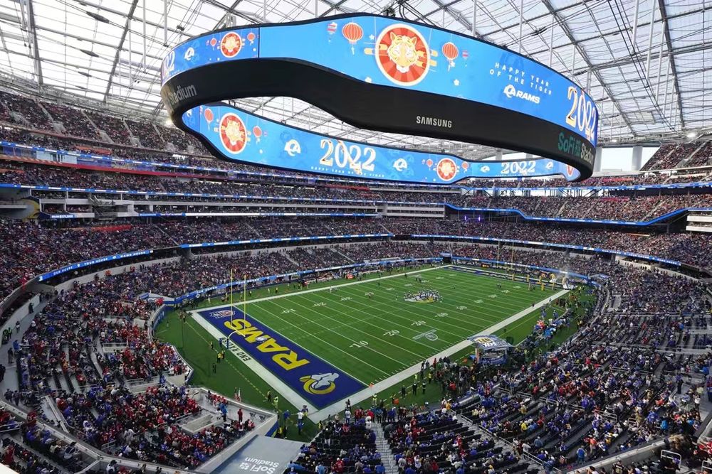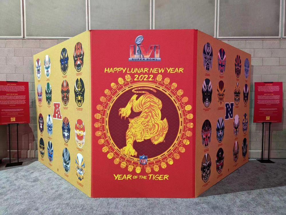 “超级碗”每年的举办时间都恰逢中国新年,NFL赛场上的中国元素也越来越多。就在今年春节期间,公羊队的主场环屏打出了“虎年快乐”的祝福语。而“超级碗”球迷主题活动的现场入口也展示了由华裔艺术家创作的NFL32支球队的京剧脸谱主题形象。