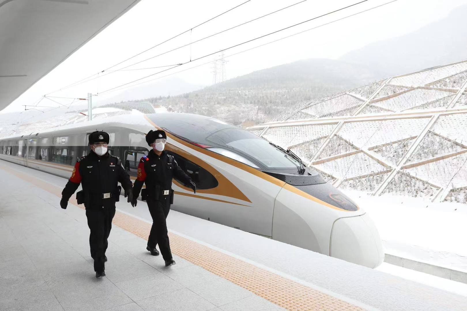 2月12日,张家口市崇礼区下起大雪,山区气温低至零下6℃,张家口赛区的铁路民警们仍坚守在各个岗位上。