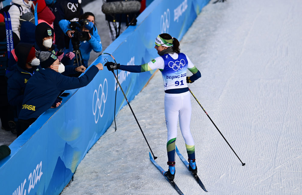 ↑在北京冬奥会张家口赛区国家越野滑雪中心,雅克利娜·莫朗与巴西队工作人员、队友相互致意(2月10日摄)。新华社记者 张宏祥 摄