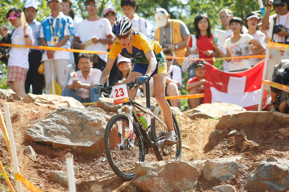 ↑雅克利娜·莫朗在北京2008年奥运会山地自行车项目比赛中(2008年8月22日摄)。新华社发