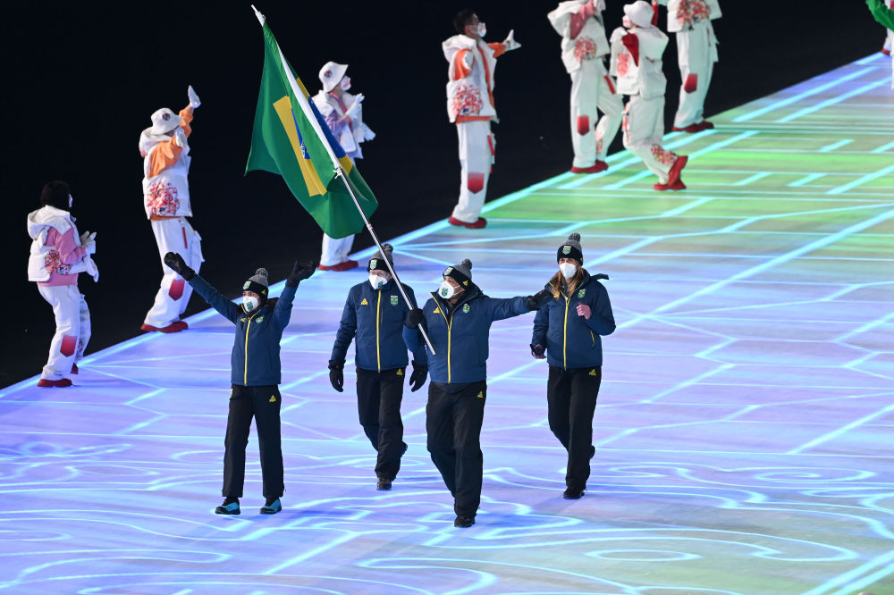 ↑在国家体育场,雅克利娜·莫朗(左一)作为巴西代表团旗手之一参加北京冬奥会开幕式。 新华社记者 黄宗治 摄