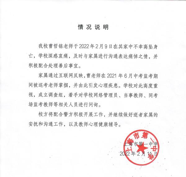 据@上海市第一中学官方 微博消息,上海市第一中学12日发布情况说明称,该校曹哲铭老师于2022年2月9日在其家中不幸高坠身亡,学校深感哀痛,及时与家属进行沟通表达痛悼之情,并积极配合处理善后事宜。