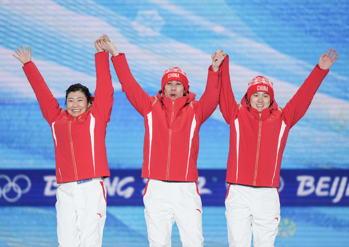2月11日,中国选手徐梦桃、贾宗洋和齐广璞(从左至右)获得自由式滑雪空中技巧混合团体银牌。新华社记者薛玉斌摄