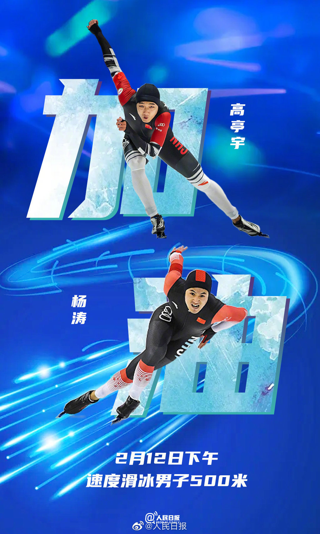 今天下午,北京冬奥会将进行速度滑冰男子500米比赛。中国选手高亭宇携手杨涛出战。高亭宇曾在平昌冬奥会为中国男子速滑实现突破、赢得500米铜牌,期待他们在今天比赛中的精彩表现。祝福所有运动员!中国队,加油!