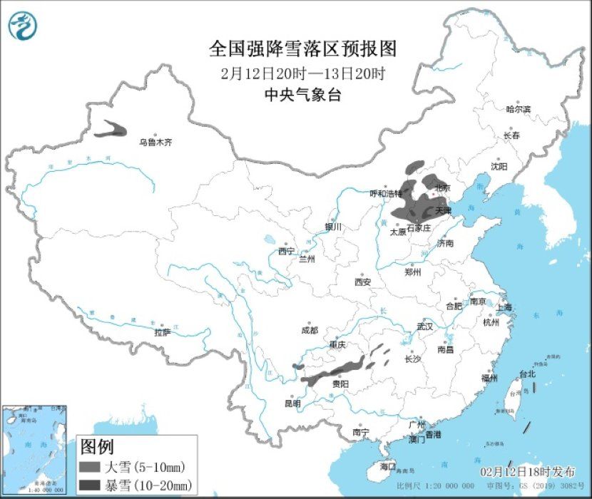 预计2月12日20时至13日20时,新疆伊犁河谷、内蒙古中部偏南、山西北部、河北中北部、北京、天津等地的部分地区,以及云南东北部、贵州北部、湖南西北部等地的高海拔山区有大雪,其中,新疆伊犁河谷、山西北部、河北中部、贵州北部等地局地有暴雪(10~15毫米)。上述地区新增积雪深度3~8厘米,局地可达10厘米以上。详情>>