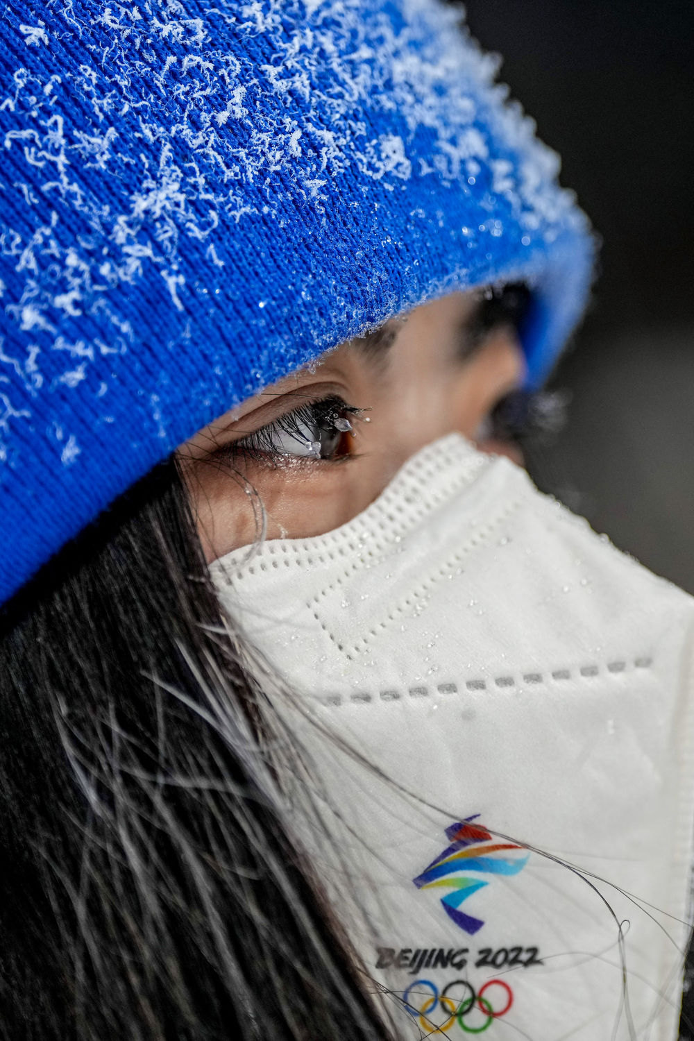 2月9日晚,在国家越野滑雪中心,一位冬奥会志愿者的睫毛上结出冰珠。新华社记者彭子洋摄