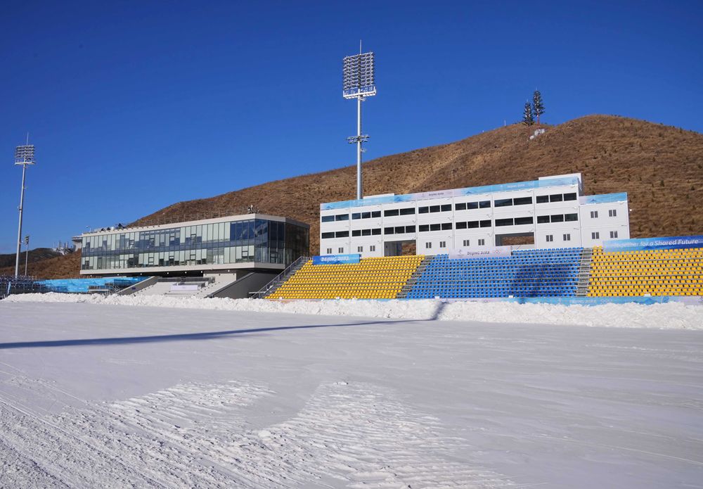 2021年12月31日,张家口赛区国家越野滑雪中心技术楼(左)和观众看台。新华社记者杨世尧摄