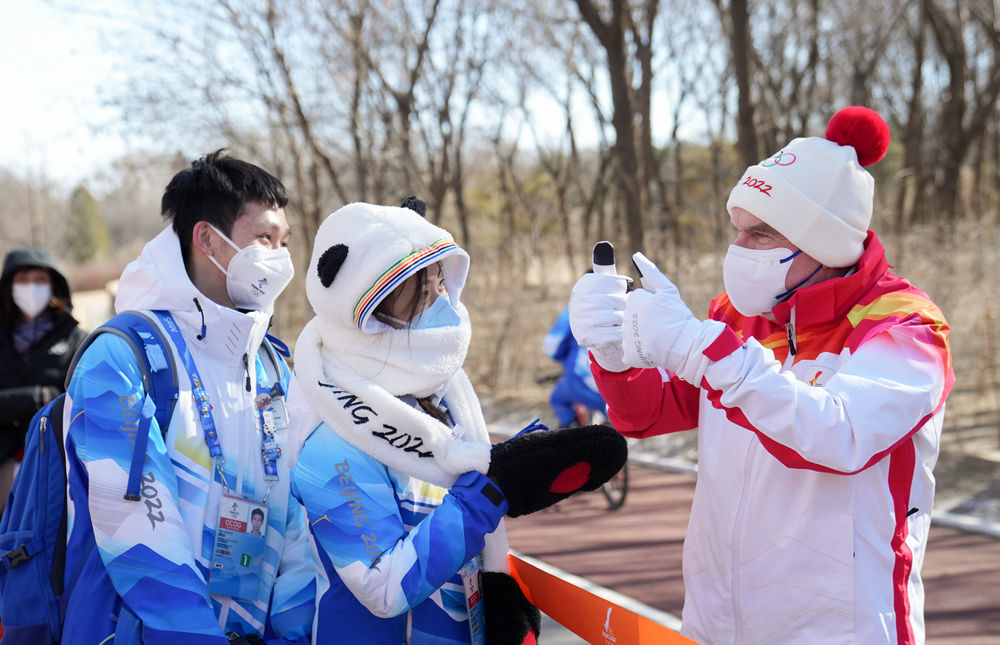 2月4日,国际奥委会主席巴赫(右)在北京冬奥会火炬传递前与志愿者交流。新华社记者鞠焕宗摄