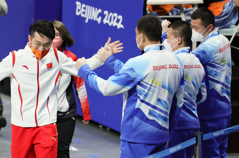 2月7日,任子威(左一)在北京冬奥会短道速滑项目男子1000米决赛夺冠后与工作人员庆祝。新华社记者兰红光摄