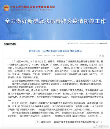 截至2月12日24时,据31个省(自治区、直辖市)和新疆生产建设兵团报告,现有确诊病例1397例(其中重症病例5例),累计治愈出院病例100897例,累计死亡病例4636例,累计报告确诊病例106930例,无现有疑似病例。累计追踪到密切接触者1556902人,尚在医学观察的密切接触者34056人。