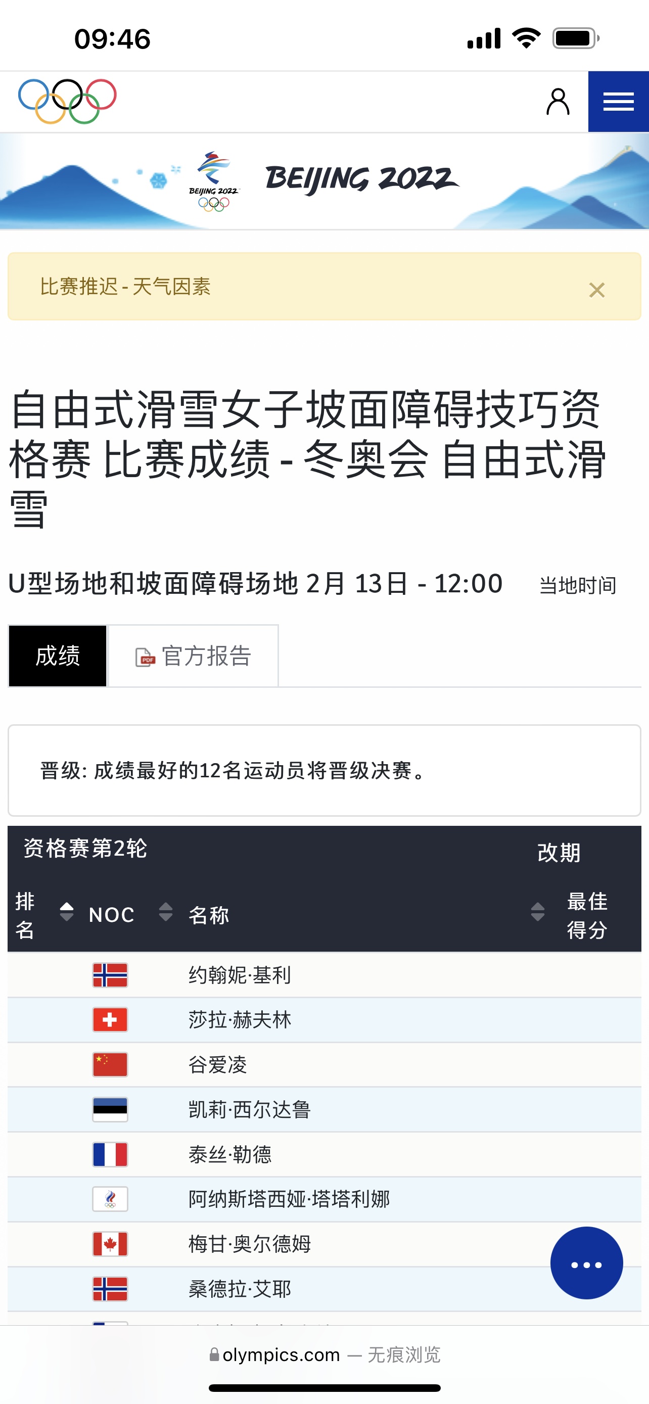 据北京冬奥会官网,原计划上午10点举行的自由式滑雪女子坡面障碍技巧资格赛,因天气原因推迟到中午12点进行。