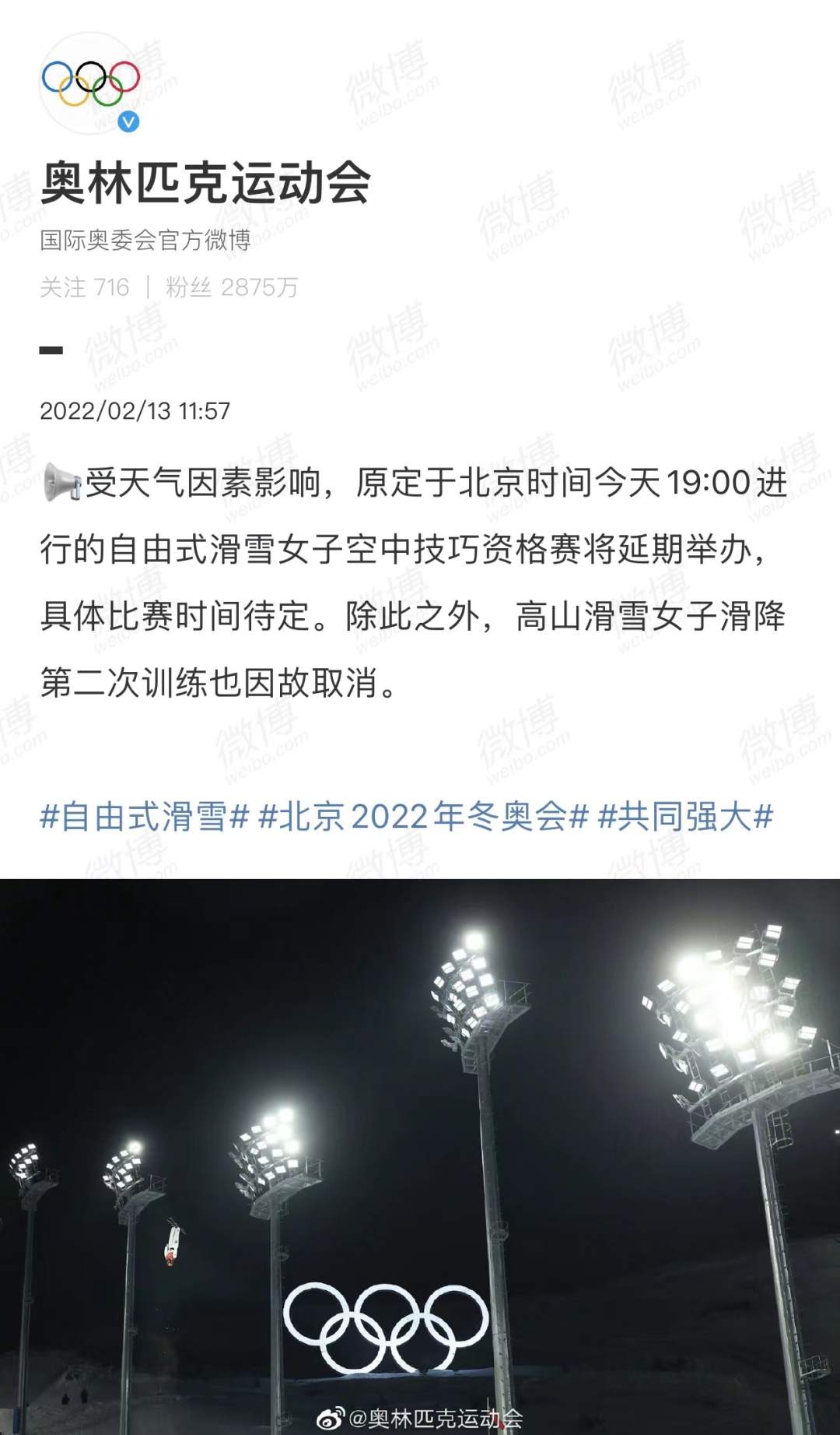 据国际奥委会官方微博消息:受天气因素影响,原定于北京时间今天19:00进行的自由式滑雪女子空中技巧资格赛将延期举办,具体比赛时间待定。除此之外,高山滑雪女子滑降第二次训练也因故取消。