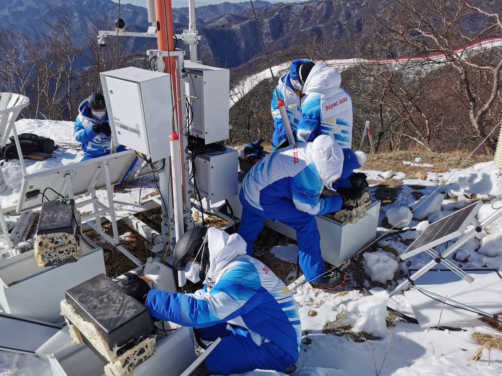 高猛等外围气象服务团队在国家高山滑雪中心赛道旁检修设备。
