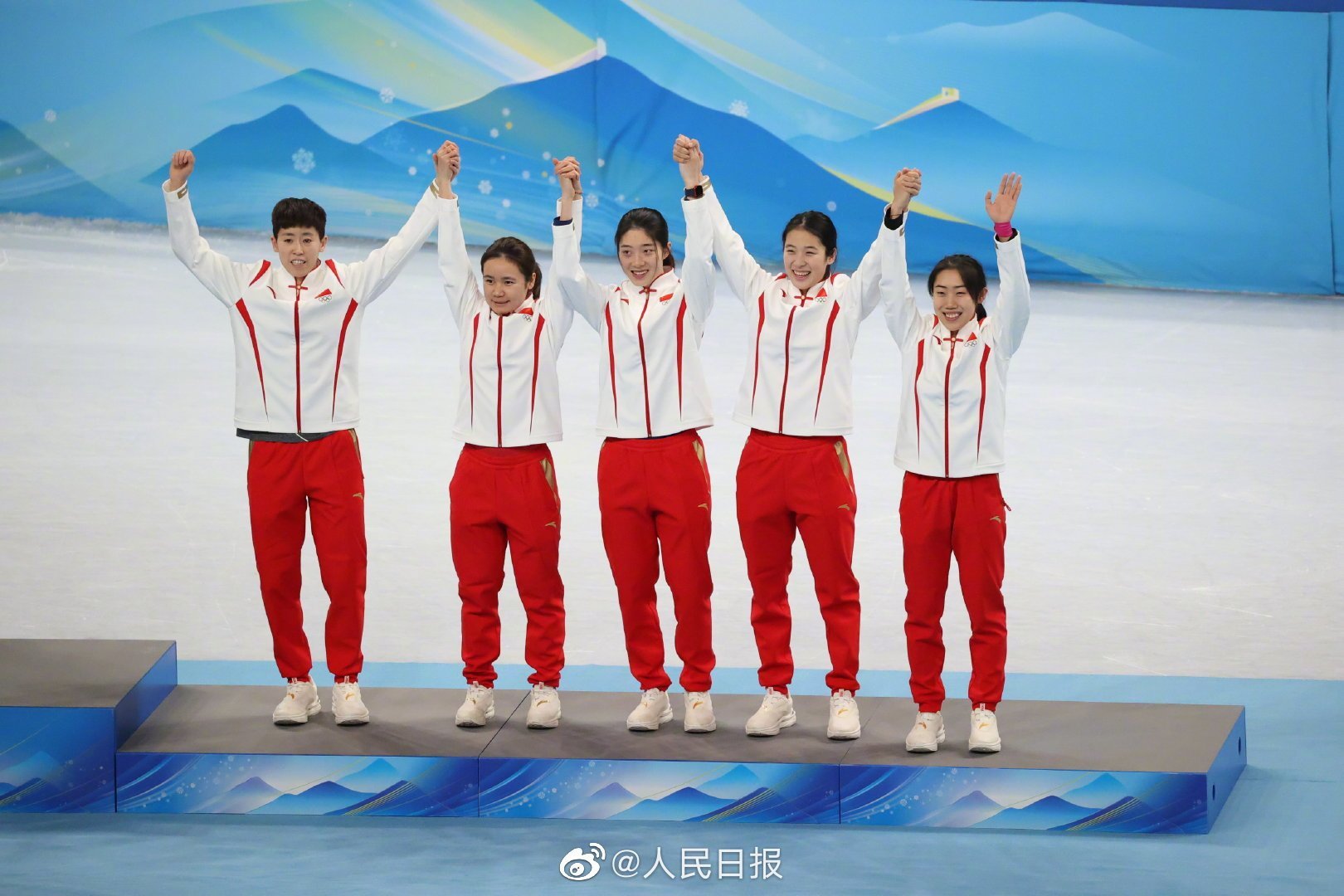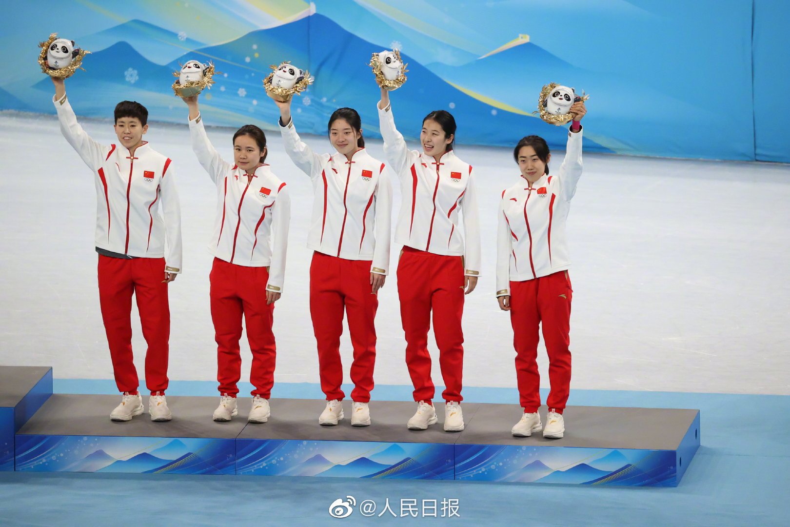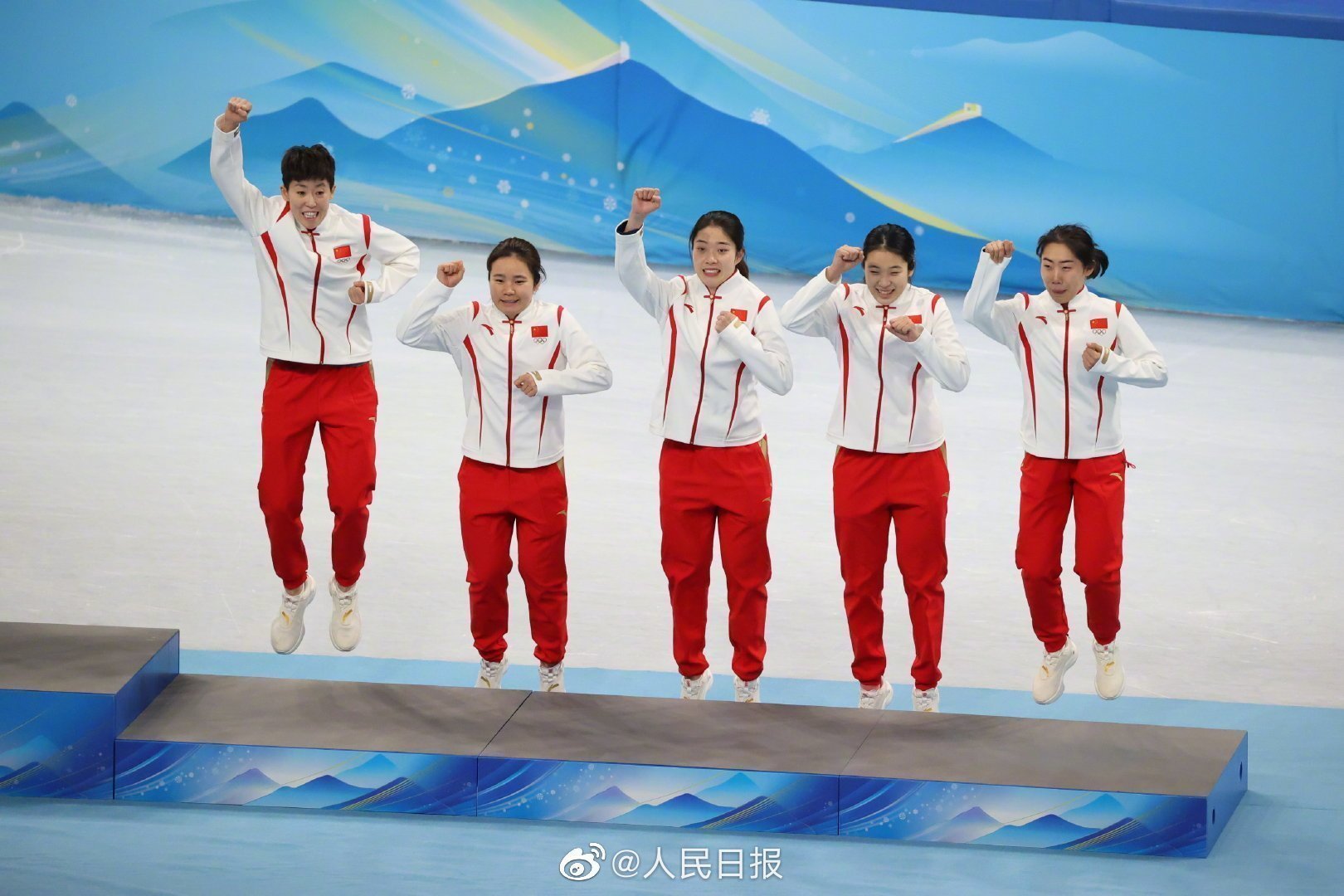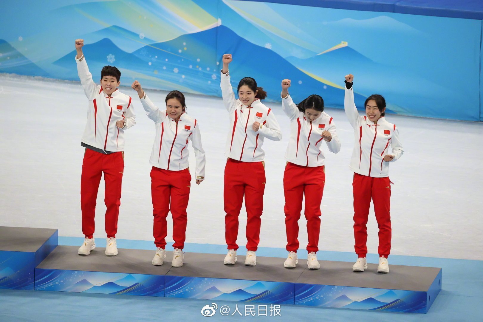中国队短道速滑女子3000米接力摘铜,赛后,中国姑娘们跳上领奖台,手举金墩墩,向观众们微笑示意。恭喜范可新、韩雨桐、曲春雨、张雨婷、张楚桐!