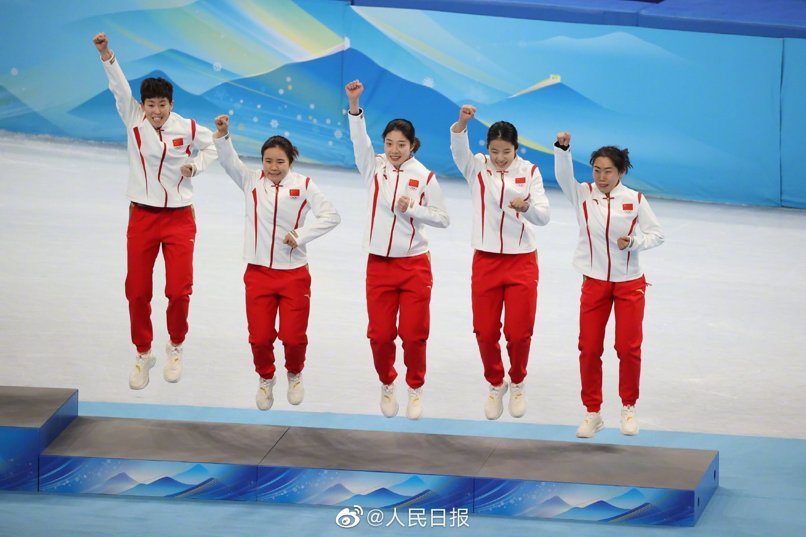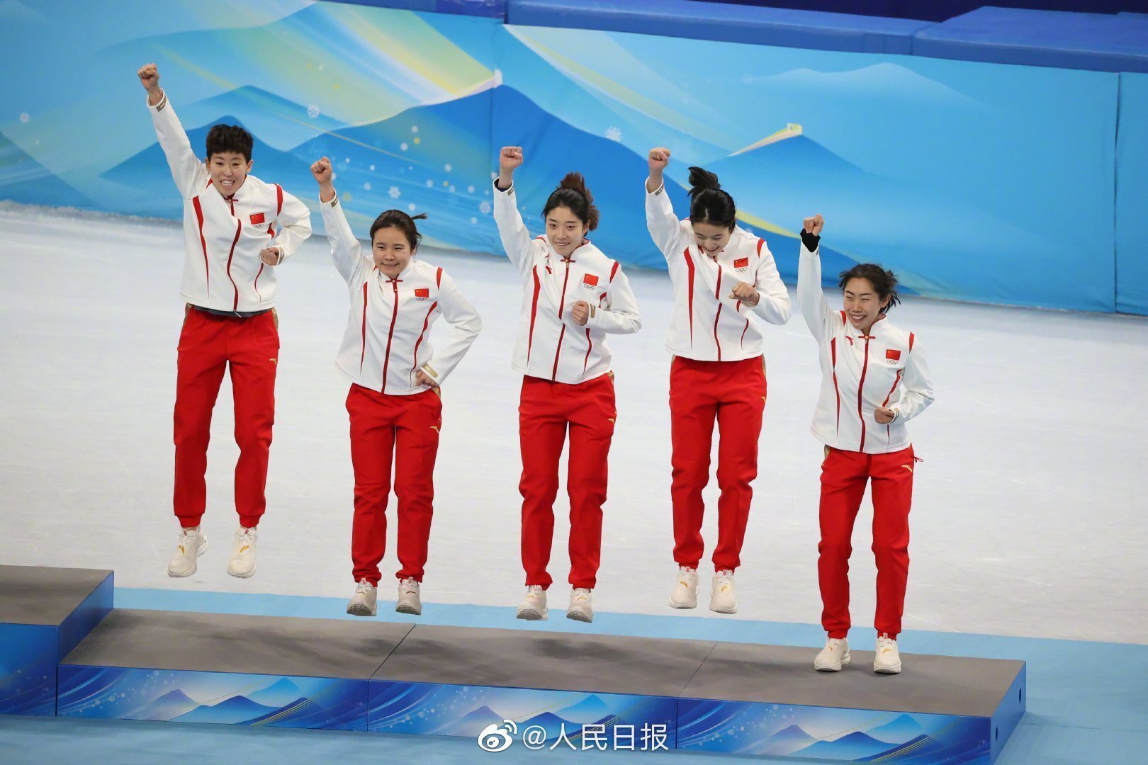中国短道速滑姑娘们跳上领奖台,手举金墩墩