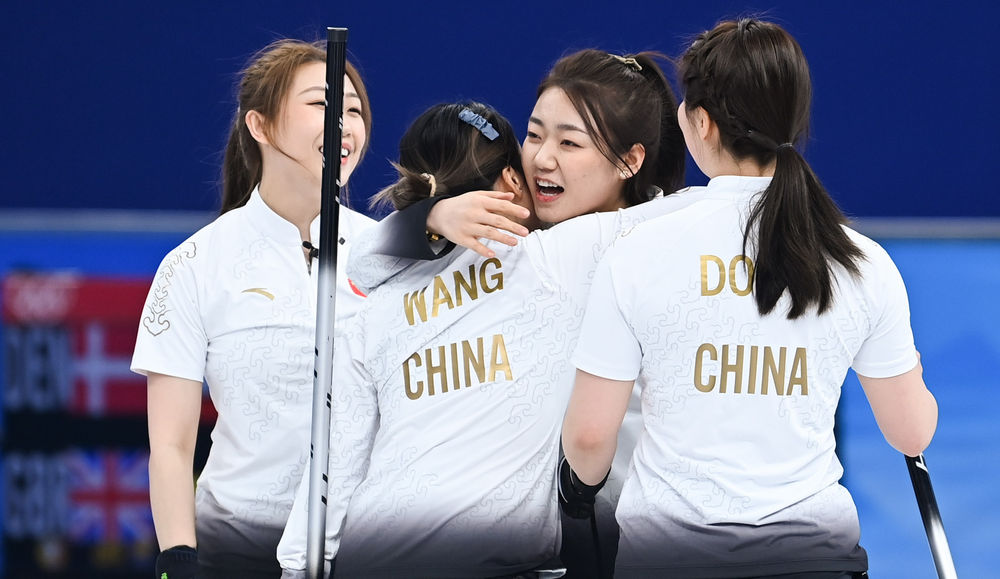2月13日,中国队选手在北京冬奥会冰壶女子循环赛后庆祝。新华社记者黄孝邦摄