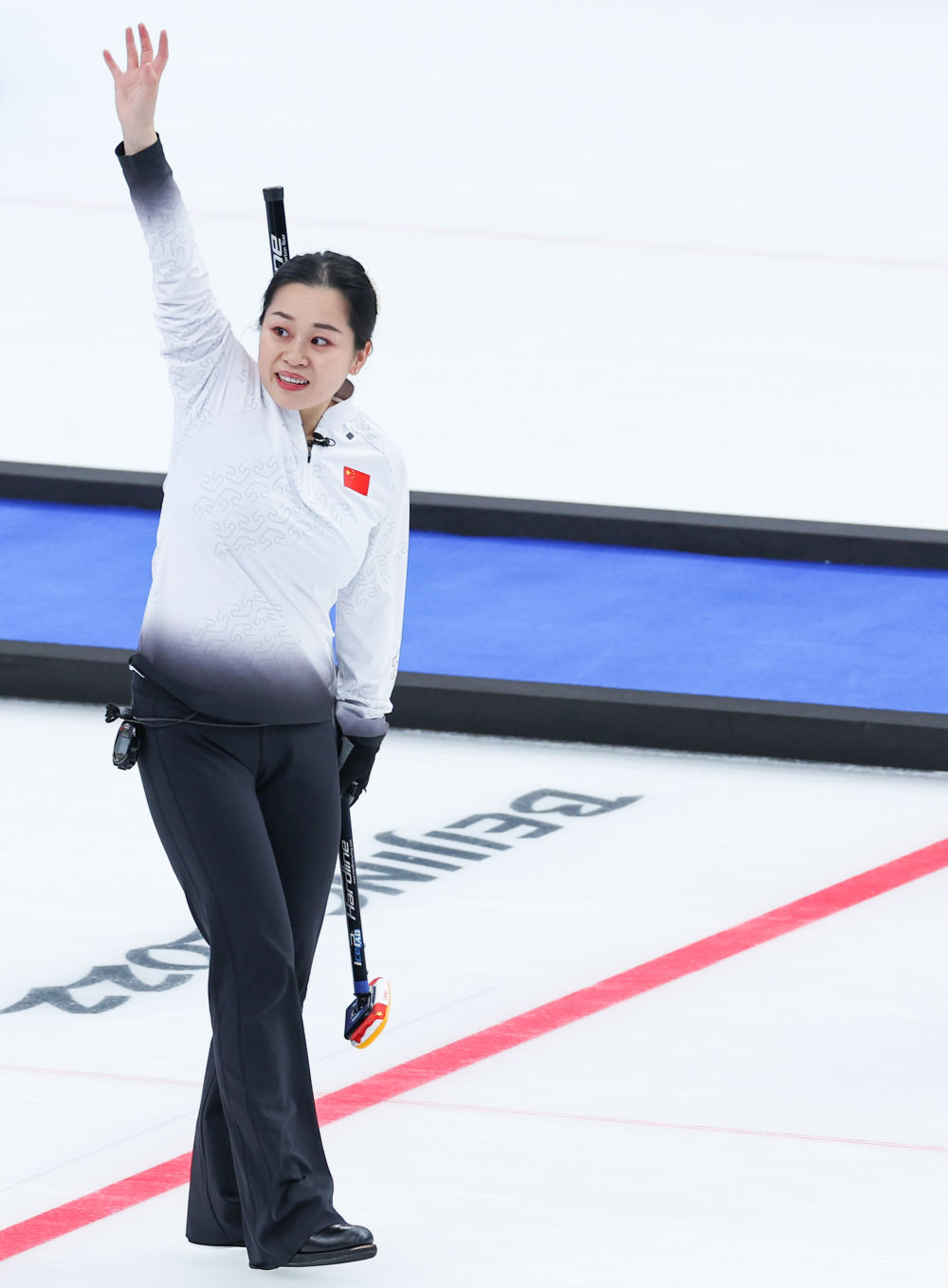 2月13日,中国队选手王芮在北京冬奥会冰壶女子循环赛后向观众致意。新华社记者王婧嫱摄