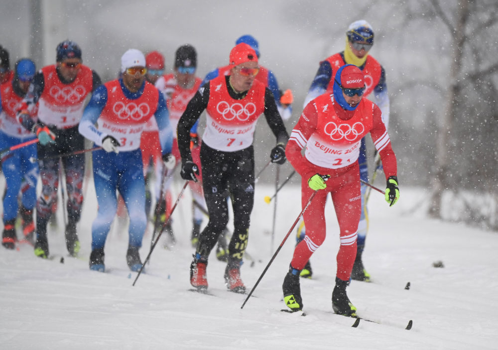 2月13日,俄罗斯奥委会队选手阿列克谢·切尔沃特金(右一)在北京冬奥会越野滑雪男子4×10公里接力比赛中。新华社记者邓华摄