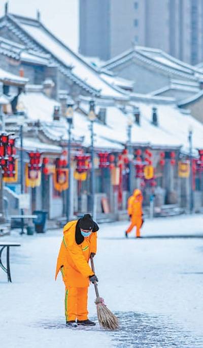 2月13日,环卫工人在内蒙古呼和浩特市玉泉区塞上老街清理积雪。