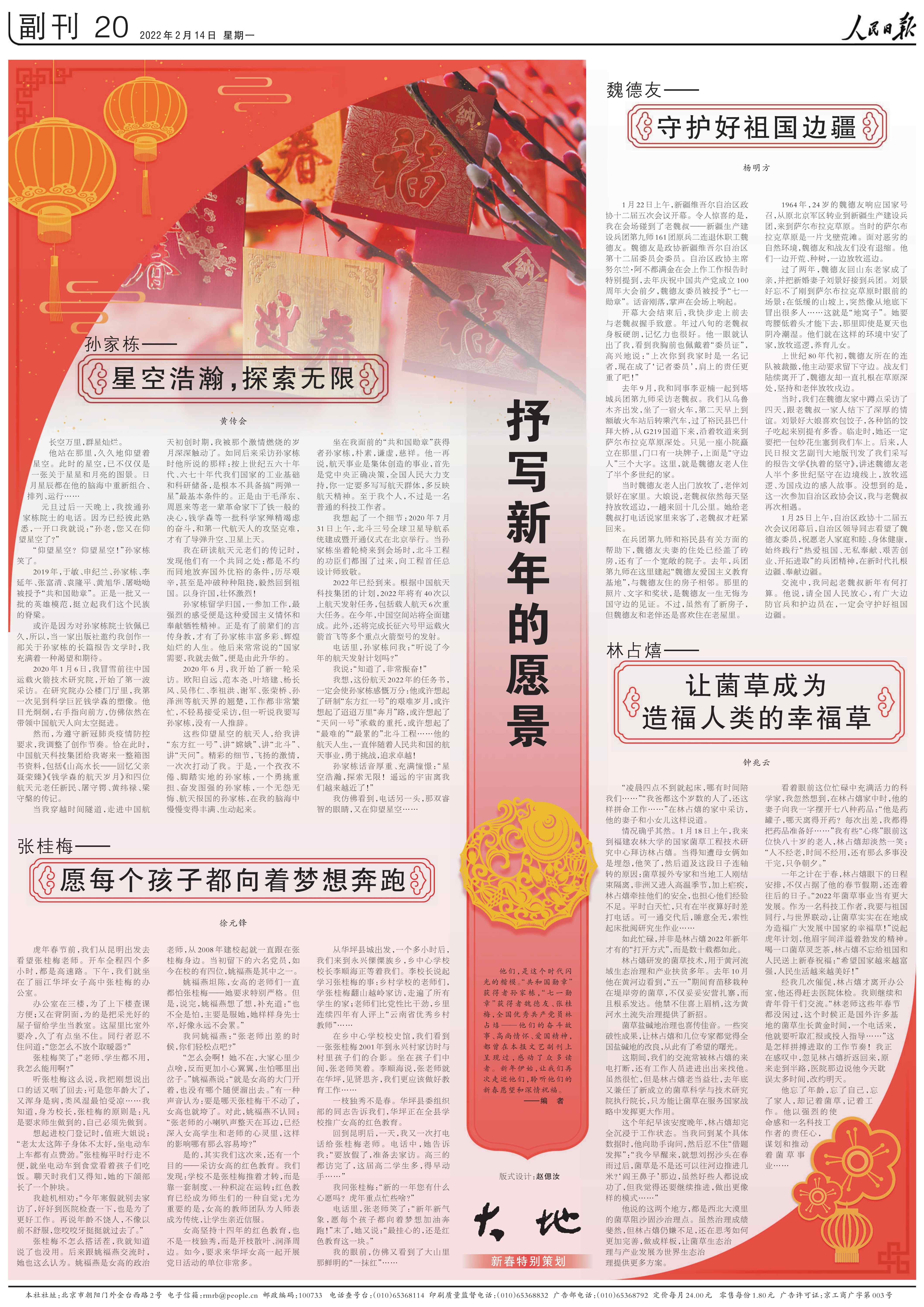 他们,是这个时代闪光的楷模。“共和国勋章”获得者孙家栋,“七一勋章”获得者魏德友、张桂梅,全国优秀共产党员林占熺——他们的奋斗故事、高尚情怀、爱国精神,都曾在本报文艺副刊上呈现过,感动了众多读者。新年伊始,让我们再次走近他们,聆听他们的新春愿望和深情祝福。