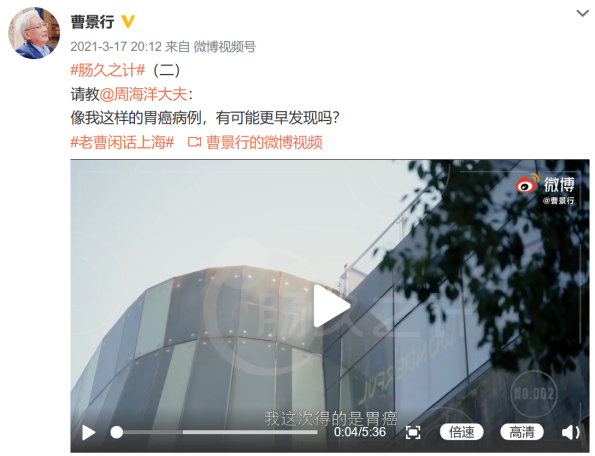 2021年3月,曹景行做了一个谈话节目《肠久之计》,节目中请来了他的主治医生之一、上海长征医院肛肠外科行政副主任周海洋讲解胃癌的防治科普,希望提醒更多的人早诊早检。