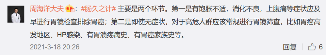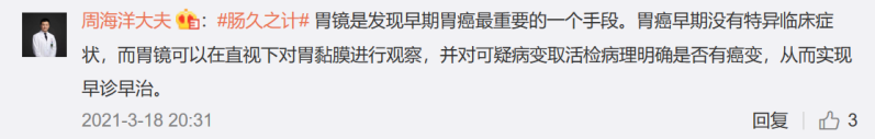节目播出后,周海洋大夫在微博回应:胃镜是发现早期胃癌最重要的一个手段。胃癌早期没有特异临床症状,而胃镜可以在直视下对胃黏膜进行观察,并对可疑病变取活检病理明确是否有癌变,从而实现早诊早治。