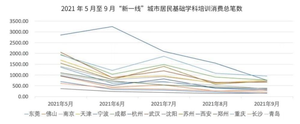 而在基础学科教育培训消费的笔数方面,2021年6-9月,杭州下降幅度最大,从3249笔下降至752笔,降幅高达76.9%;其他“新一线”城市较各自极值下降幅度最大的是武汉,从2021年5月的2052笔下降至9月的668笔,下降了67.4%。
