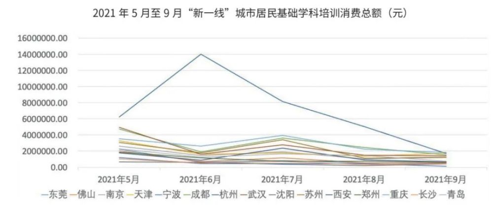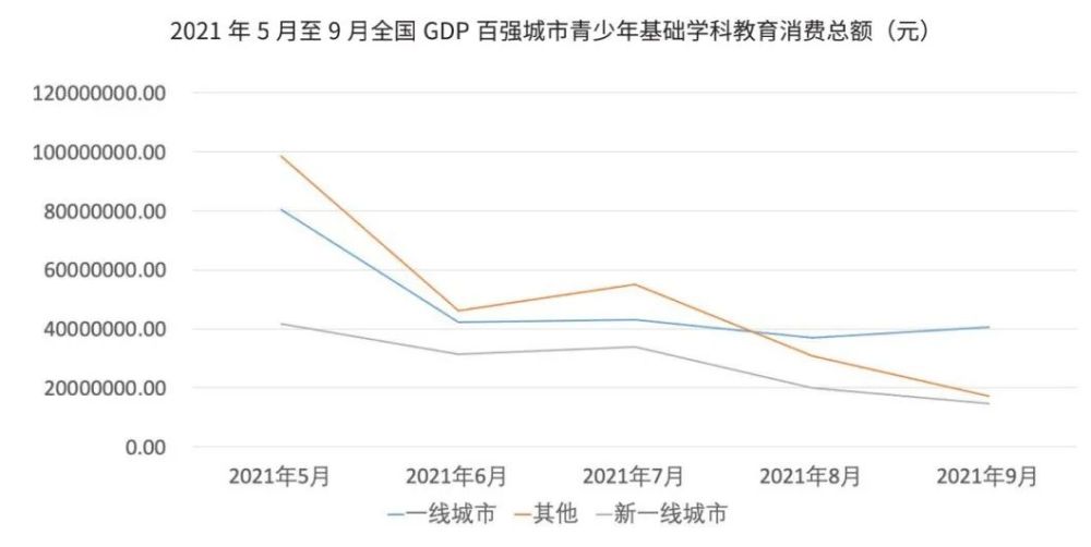 《报告》显示,从2021年5月至2021年9月,百城居民基础学科教育培训消费的支出总额,从2.2亿元下降至7240万元,降幅达68%;一线、“新一线”和其他百强城市分别下降49.4%、64.7%、82.6%。