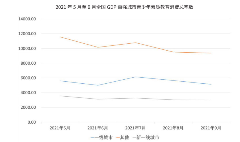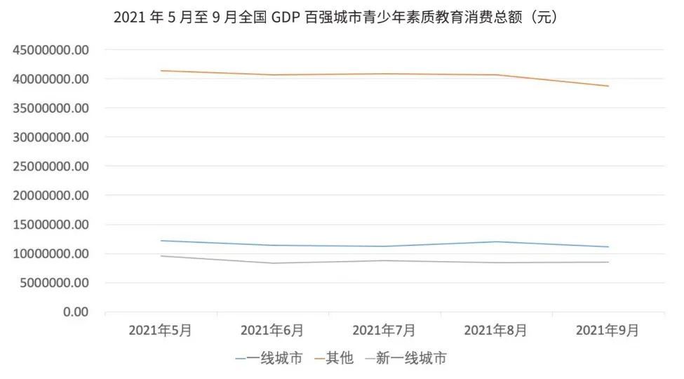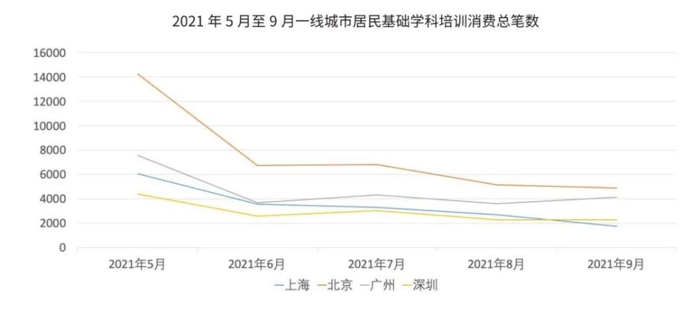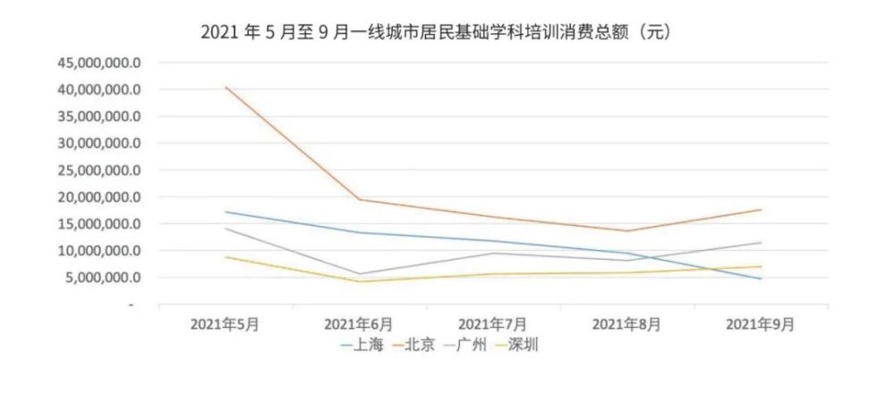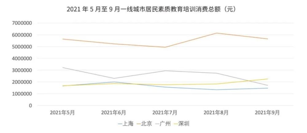 但在四大一线城市中,除北京外,上海、广州、深圳在2021年5-9月的素质教育培训消费总额并未出现明显上升态势。