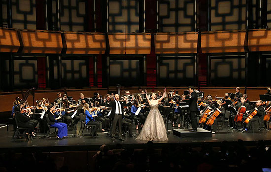 演出最后部分的中国歌曲串烧将音乐会推向高潮。京剧表演艺术家宋飞鸿一边演唱自己创作的歌曲《颂西湖》,一边手书“福”字给现场观众,引得喝彩连连。美国女高音Esther Maureen Kelly与男中音José Rubio一首首耳熟能详的中文老歌,唱出华人心中温存的记忆,《大海啊故乡》《月亮代表我的心》《白毛女》选段,字正腔圆,声情并茂,赢得如潮掌声。音乐会在融合江苏民歌《茉莉花》和普契尼“歌剧版茉莉花”的歌剧《从茉莉花到图兰朵》中落下帷幕。依依不舍的掌声与此起彼伏的喝彩声印证着音乐会的圆满成功。