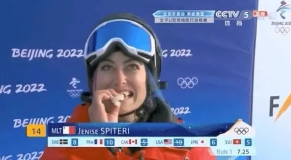 作为马耳他唯一一位冬奥会运动员,珍妮丝·斯皮泰里把中国的豆沙包带到了赛场,并且在等待分数的时候,她从口袋里掏出豆沙包,在吃的同时,还不忘对着镜头竖起大拇指。