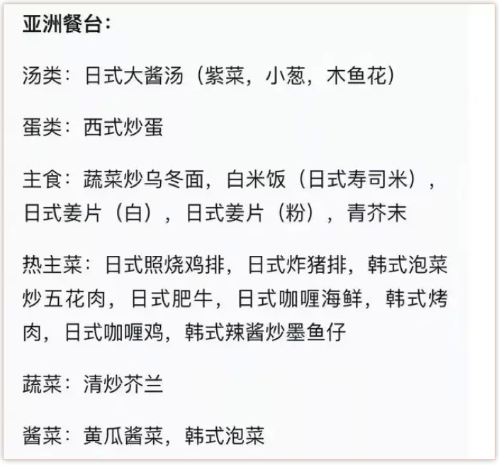 并且,为满足不同国家和地区口味,菜品样式也是多种多样,有世界餐台、亚洲餐台、中餐餐台、清真餐台、披萨与意大利面餐台,等等。