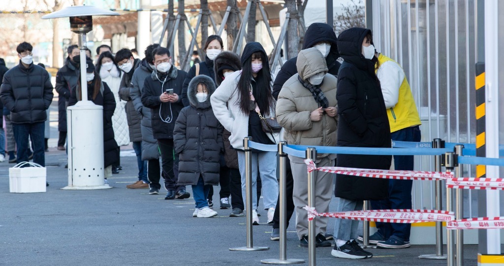 2月2日,人们在韩国首尔一处新冠检测点排队。(新华社发,徐儒锡摄)