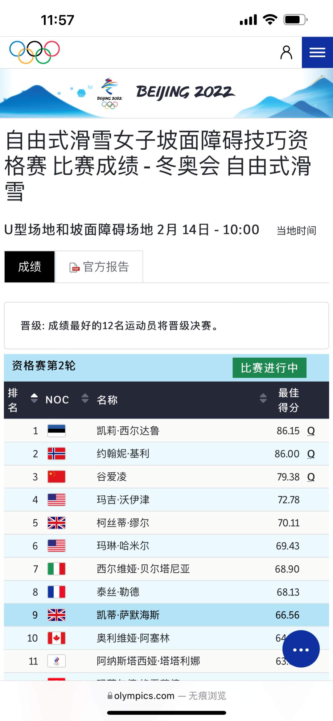 2月14日上午,北京冬奥会自由式滑雪女子坡面障碍技巧资格赛,中国队选手谷爱凌迎来在张家口赛区的首秀。最终她以79.38分的成绩,在27名选手中排名第三,已确认晋级决赛。队友杨硕瑞正在等待第二滑中。资格赛分两轮进行,取选手最好成绩排名,前12名进入决赛。