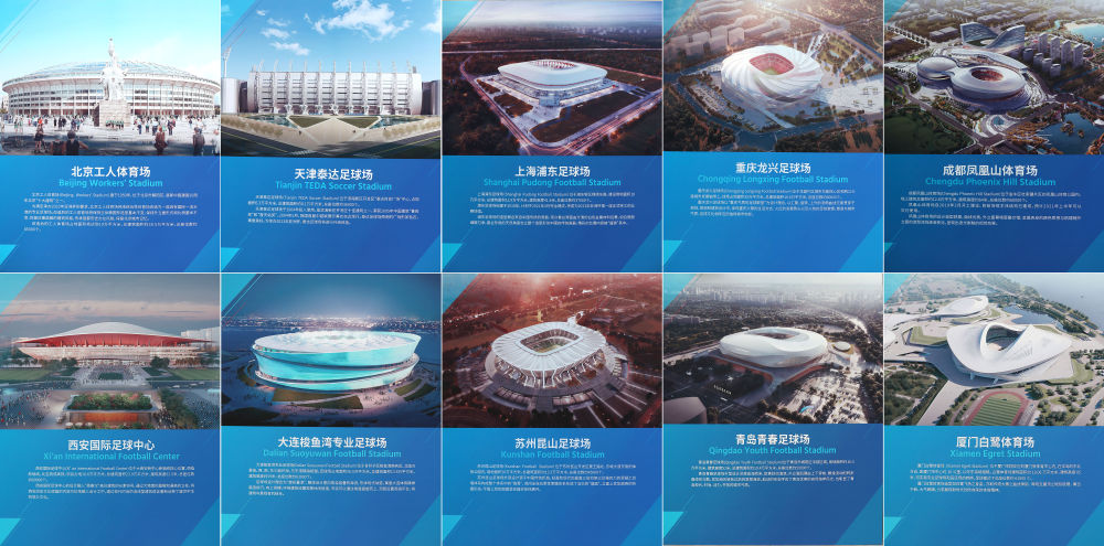 这是2023年亚足联亚洲杯承办城市体育场效果图翻拍的拼版照片。新华社记者丁旭摄