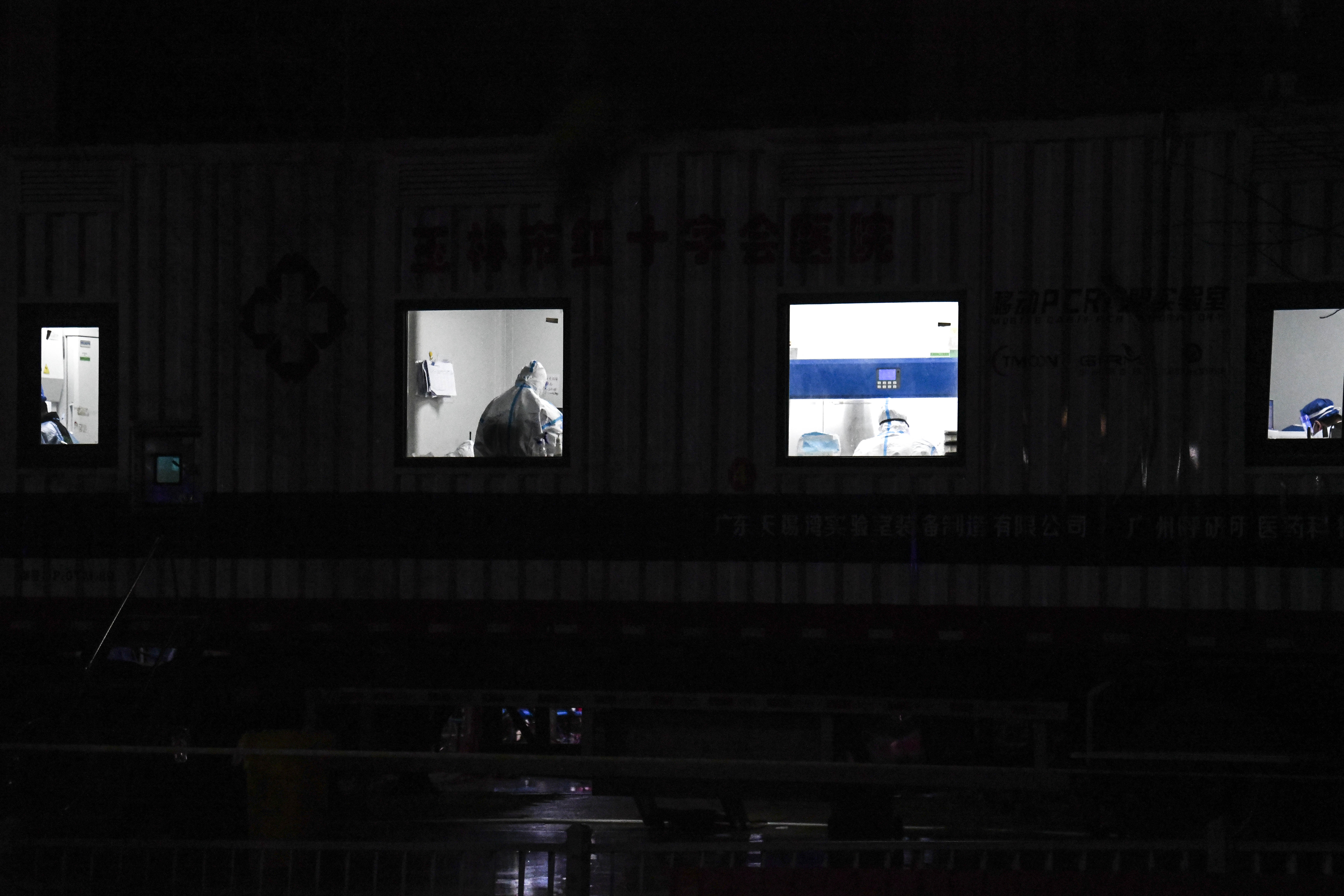 新华社照片,德保(广西),2022年2月14日 移动实验室助力广西德保阻击新冠疫情 2月13日夜,检测人员在移动核酸检测车内工作。 连日来,为提升广西百色市德保县核酸检测速度,多地支援的移动核酸检测车、移动方舱实验室和气膜实验室相继投入使用,助力德保县应对本轮疫情。 新华社记者 曹祎铭 摄